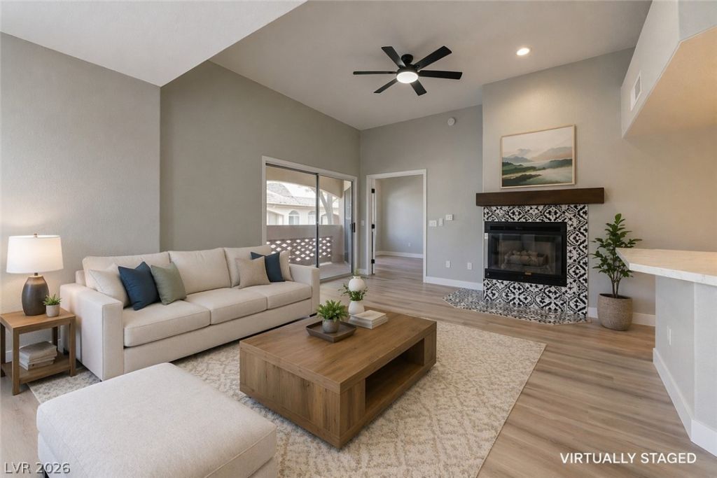 Charming 2 bedroom, 1 bathroom second floor unit located in a gated community. This home features a comfortable great room with a cozy fireplace, a spacious walk in shower, and has been recently renovated, making it perfect for relaxing. Enjoy your own private balcony, ideal for a quiet outdoor retreat. The property offers convenient access to local schools, parks, and shopping, and is just minutes from the Las Vegas Strip.