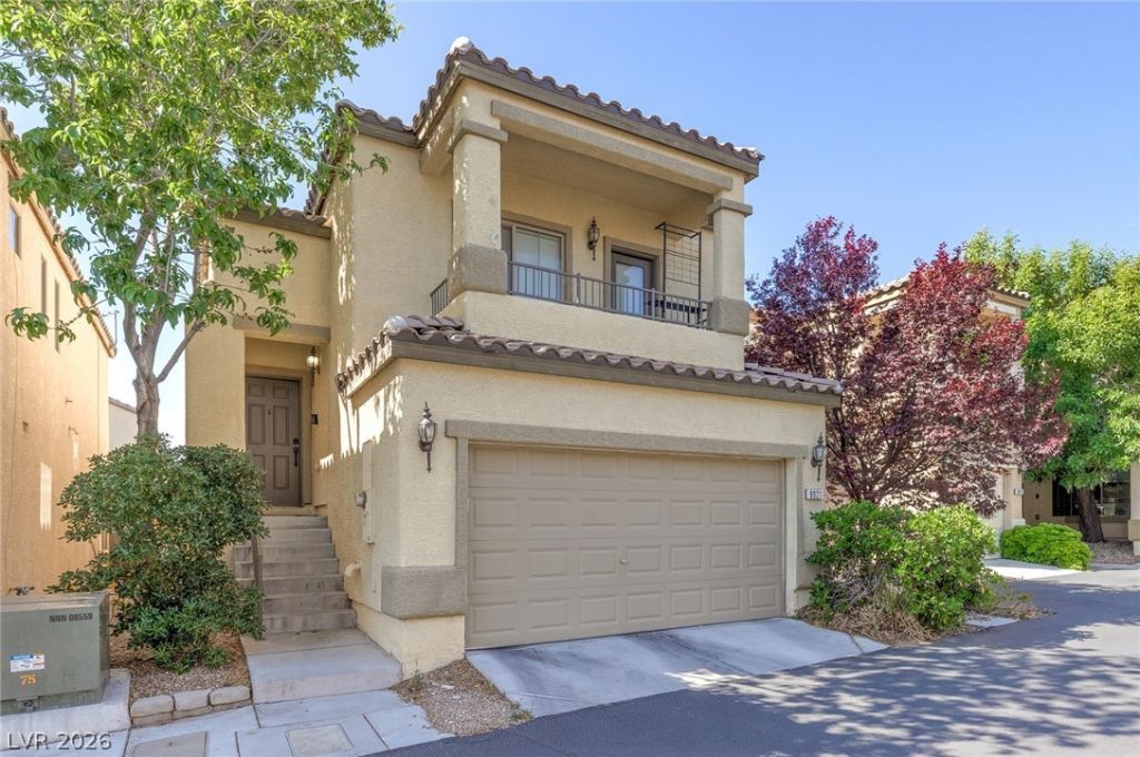Beautiful 3-bedroom, 2.5-bath home in a gated Centennial Hills community with resort-style amenities including a pool, spa, and park. This split-level layout offers a spacious primary suite, upgraded kitchen with large island, bright living and dining areas, office nook, and private balcony upstairs. Downstairs features a family room, two guest bedrooms, full bath, and laundry closet. Enjoy a low-maintenance backyard with artificial turf and a sliding glass door for indoor-outdoor living. Upgrades include luxury vinyl plank flooring, carpeted bedrooms, and custom wood paneling. Includes a 2-car garage with 240V EV outlet.
